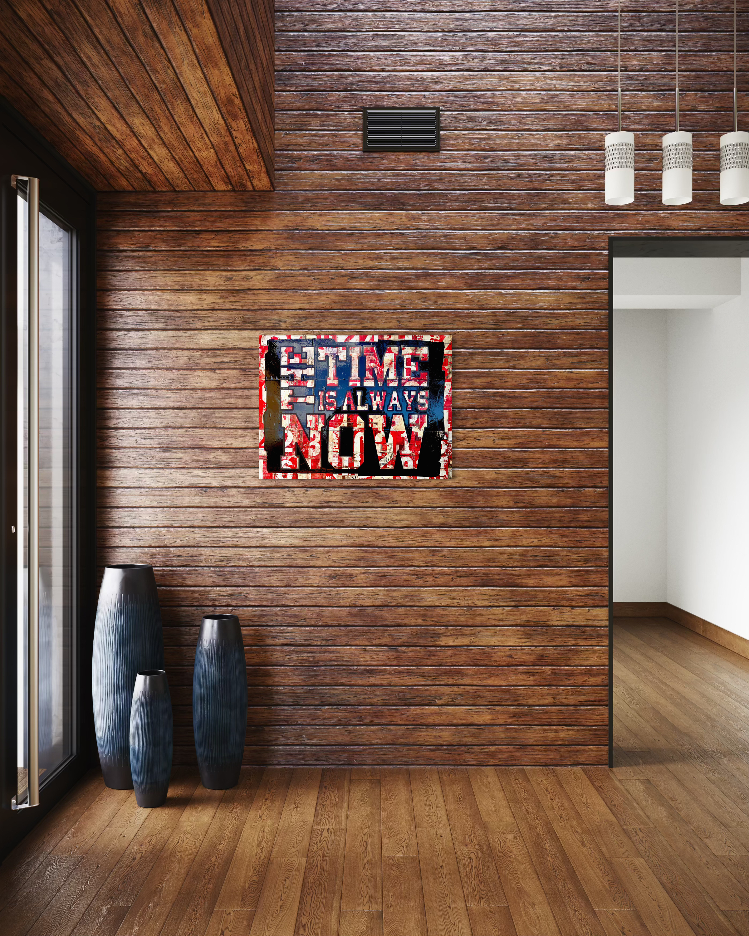 This piece features a highly impactful typographic composition centered on the phrase “THE TIME IS ALWAYS NOW,” arranged in monumental characters that structure the entire surface. The background is composed of multiple layers of color —predominantly reds, whites, and earthy tones— applied through superimposed techniques that evoke the aesthetic of weathered urban posters.