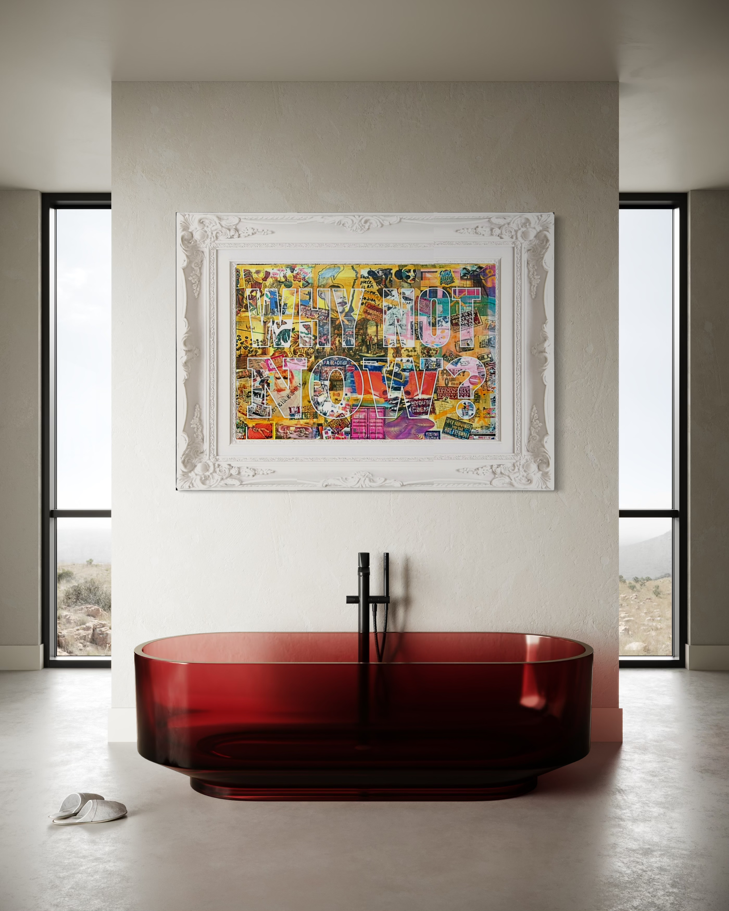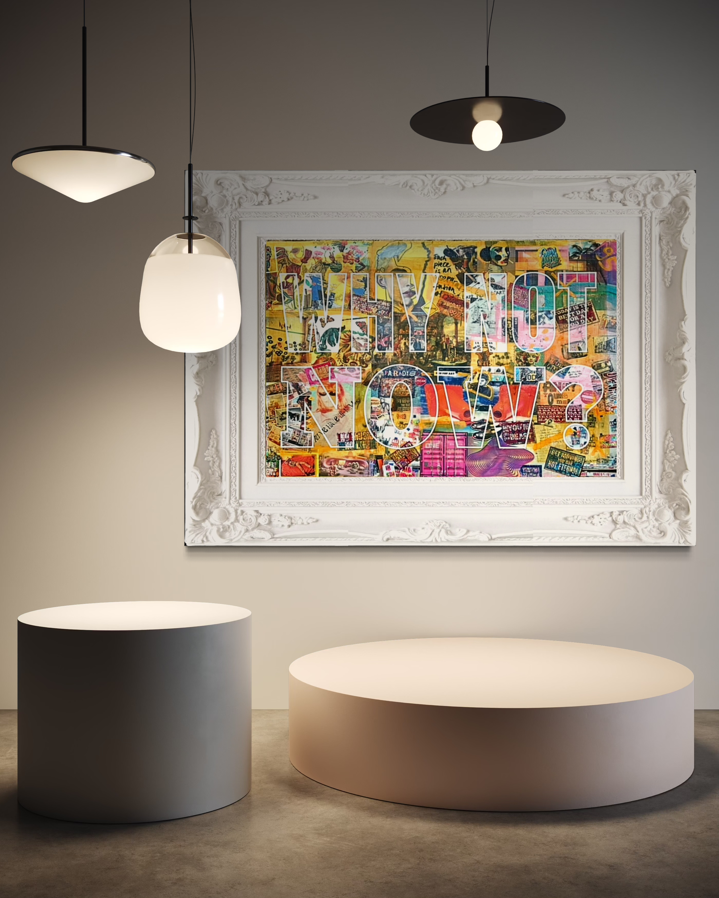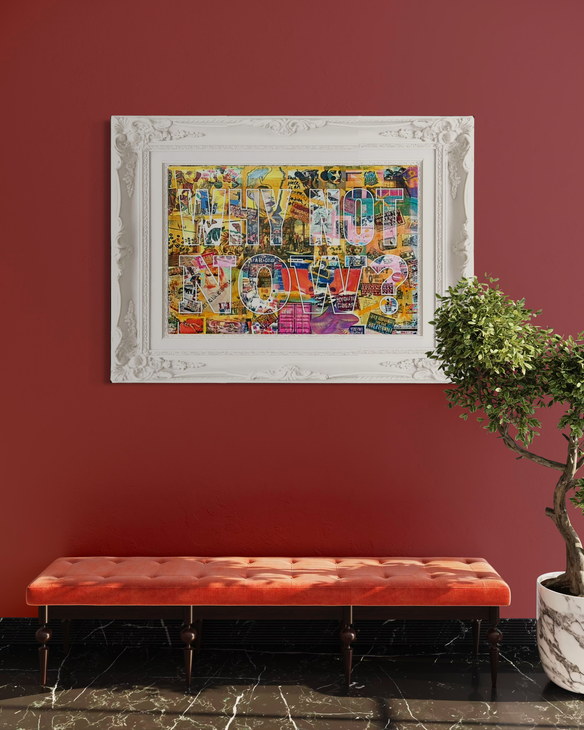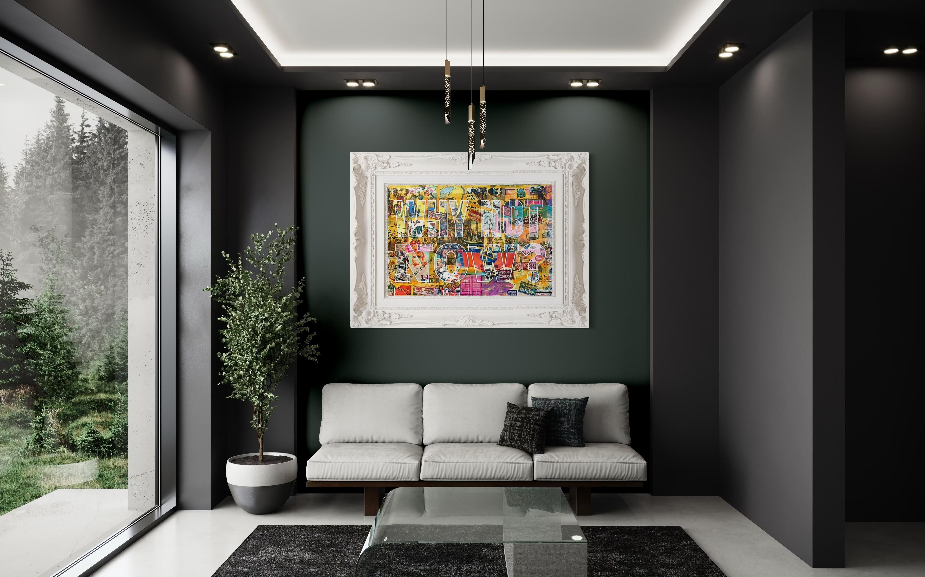 Why Not Now? is an explosion of color, texture, and meaning. This mixed-media piece blends collage and acrylic to create a visual dialogue between past and present — a confrontation with hesitation, urging the viewer toward action.